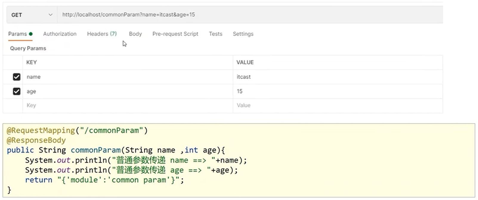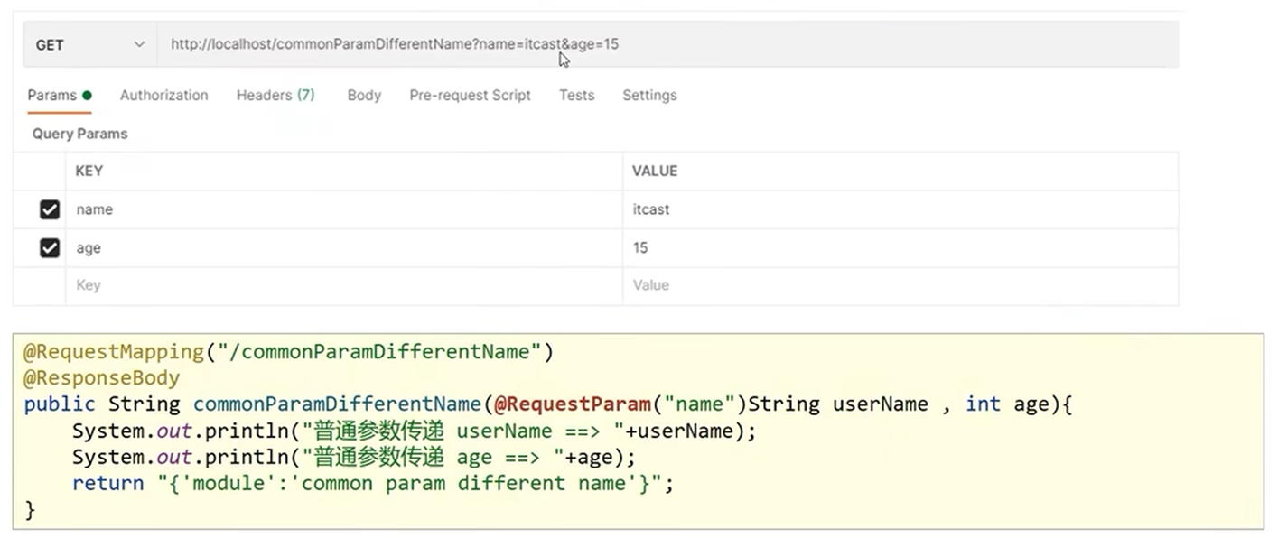 普通参数: 请求参数名与形参变量名不同,使用@RequestParam绑定参数关系