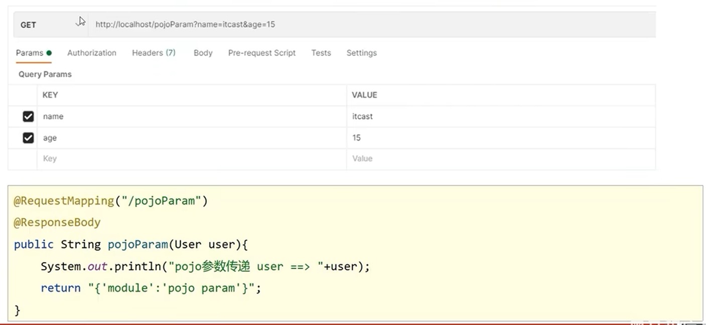 POJO参数: 请求参数名与形参对象属性名相同,定义POJO类型形参即可接收参数