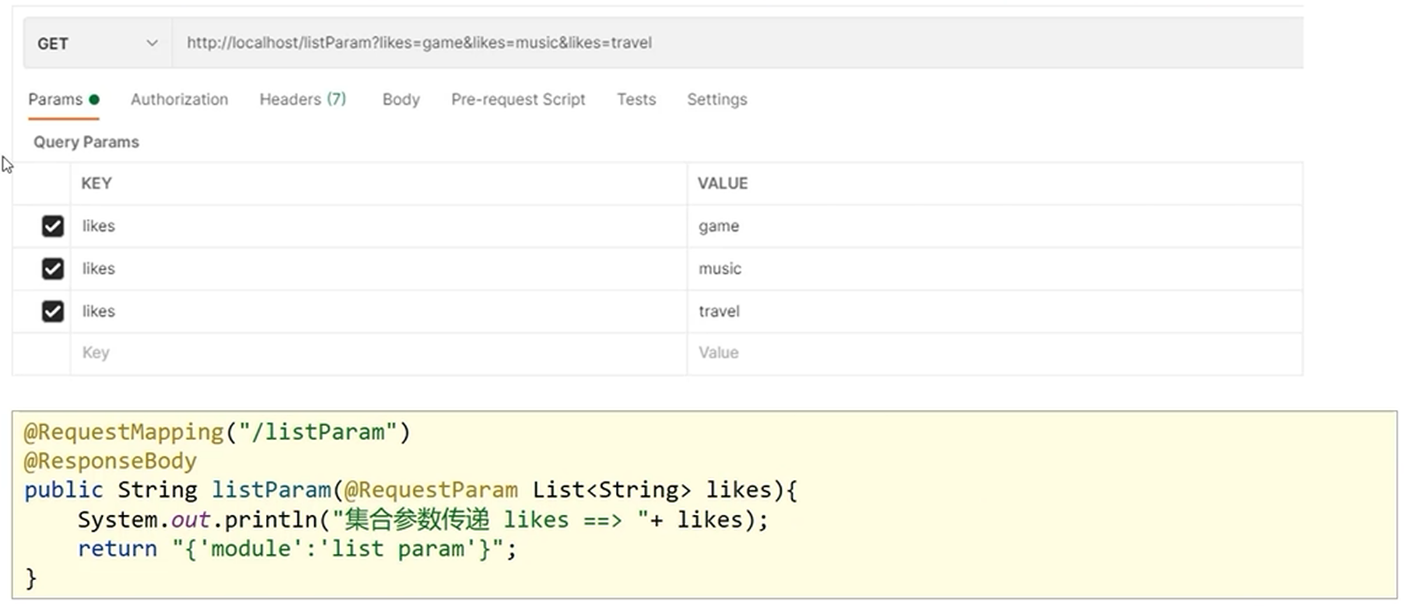 集合保存普通参数: 请求参数名与形参集合对象名相同且请求参数为多个,@RequestParam绑定参数关系