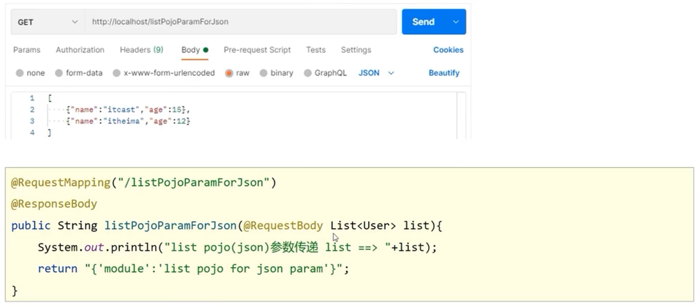 POJO集合参数: json数组数据与集合泛型属性名相同,定义List类型形参即可接收参数