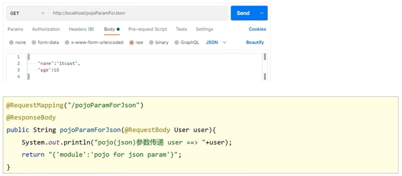 POJO参数: json数据与形参对象属性名相同,定义POJO类型形参即可接收参数