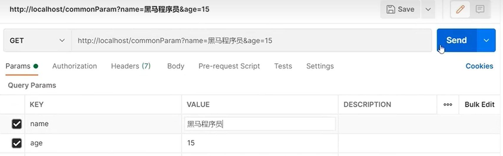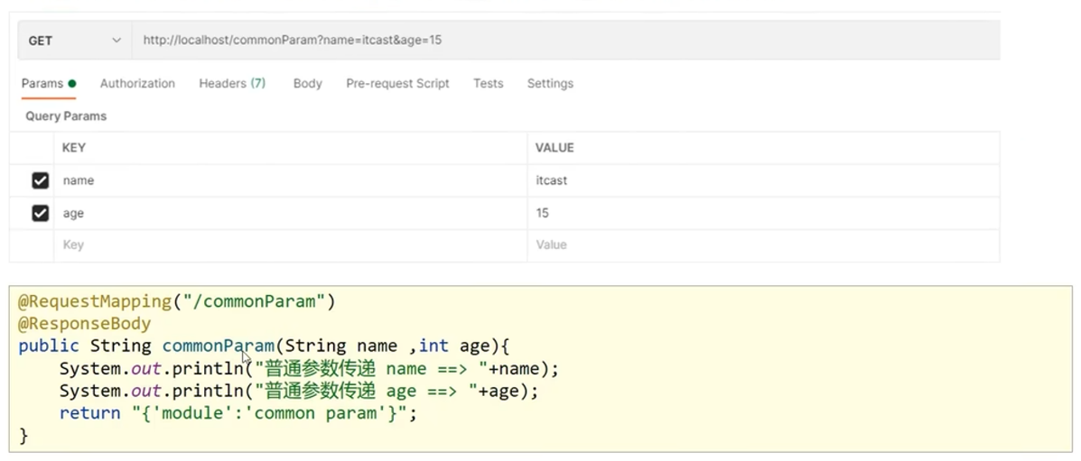 普通参数: url地址传参,地址参数名与形参变量名相同,定义形参即可接收参数