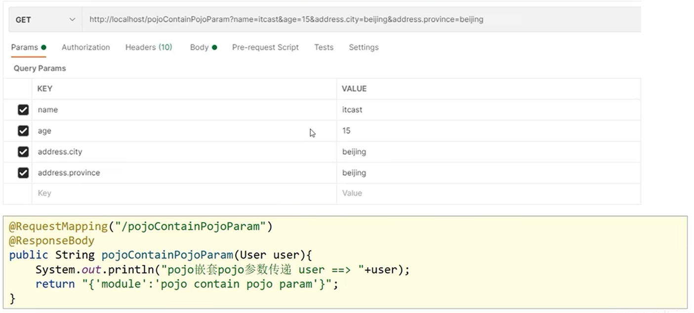 嵌套POJO参数: 请求参数名与形参对象属性名相同,按照对象层次结构关系即可接收嵌套POJO属性参数
