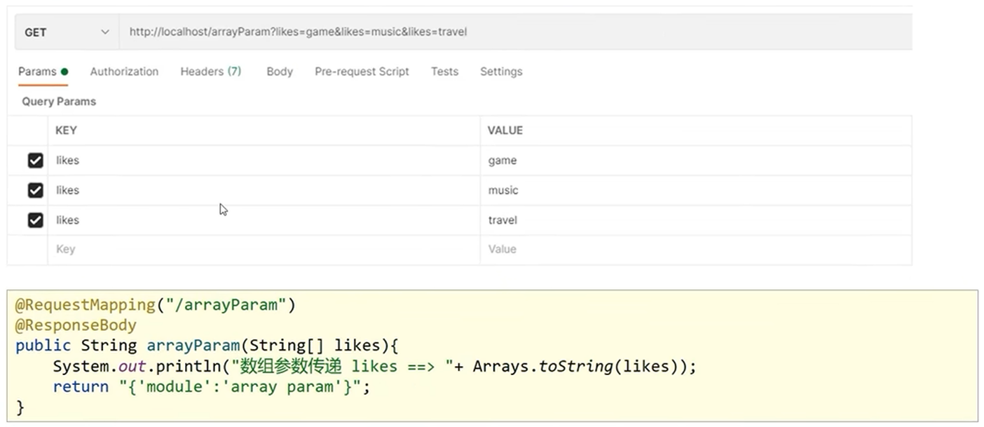 数组参数: 请求参数名与形参对象属性名相同且请求参数为多个,定义数组类型形参即可接收参数