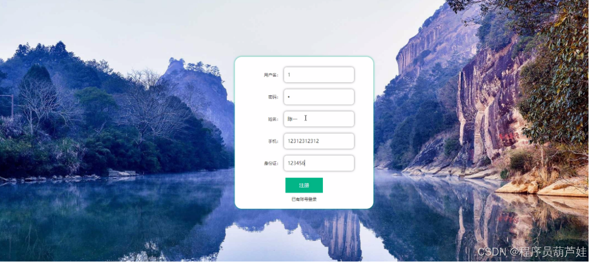 图5-2用户登录、用户注册界面图【用户登录、用户注册,在注册页面可以填写用户名、密码、姓名、手机、身份证等信息进行注册、登录,如图5-2所示。】