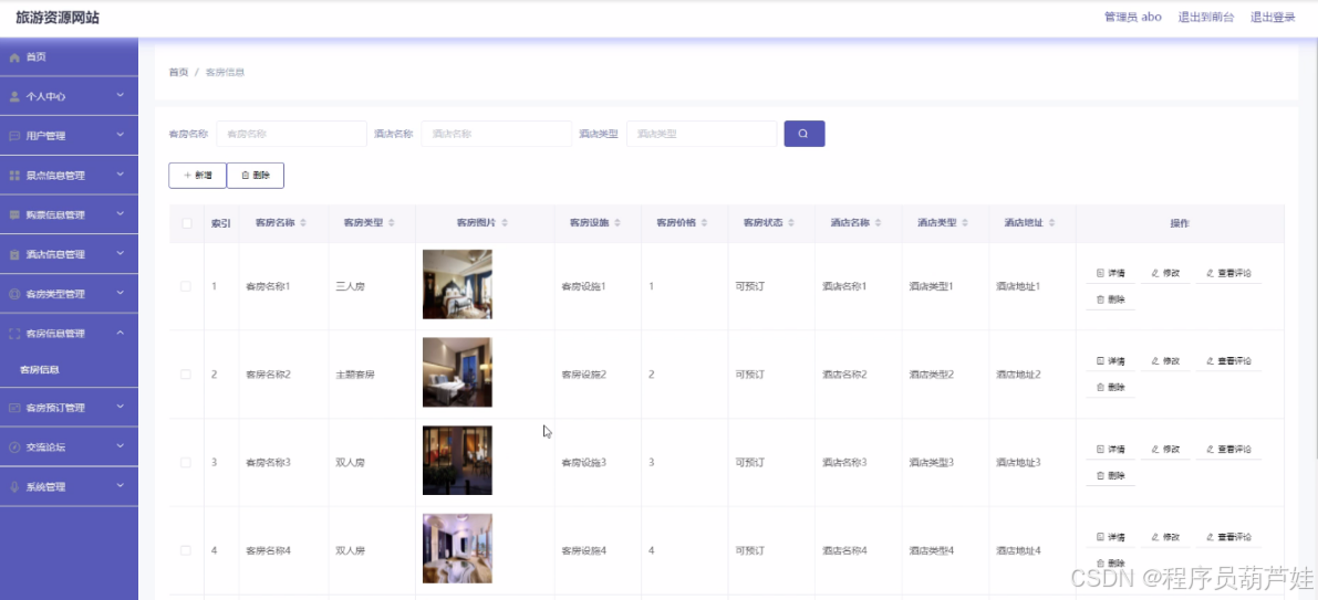 图5-10客房信息管理界面图【客房信息管理,在客房信息管理页面中可以查看客房名称、客房类型、客房图片、客房设施、客房价格、客房状态、酒店名称、酒店类型、酒店地址等内容,并且根据需要对已有客房信息管理进行详情,修改或删除等详细操作,如图5-10所示。】