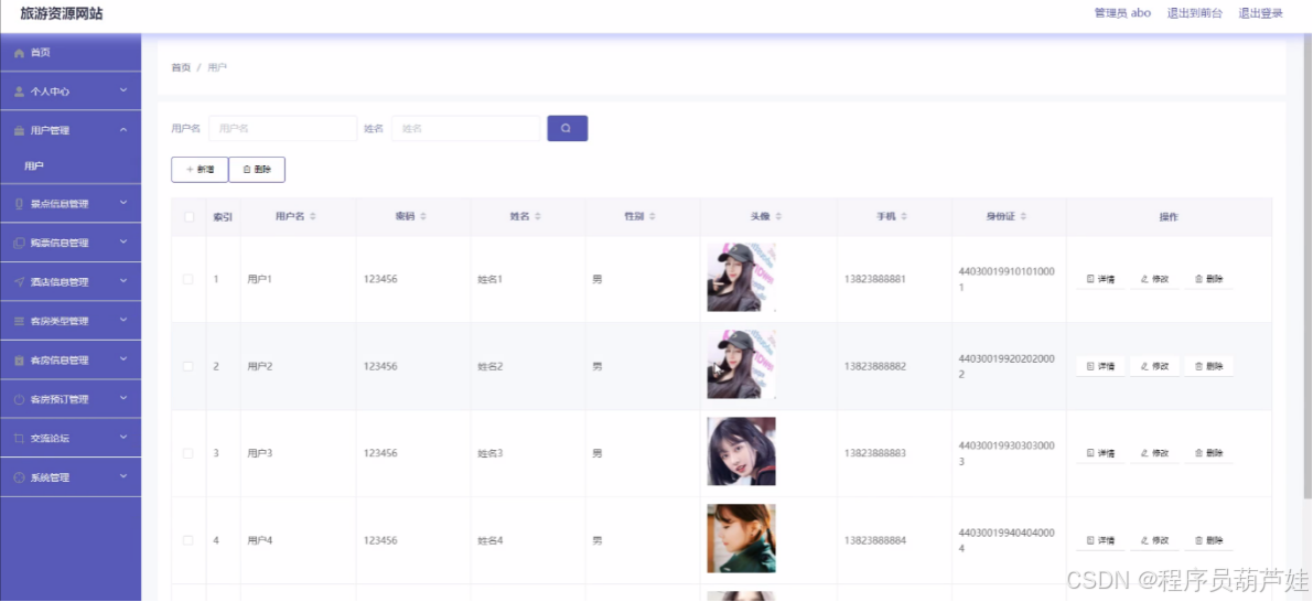 图5-6用户管理界面图【用户管理,在用户管理页面中可以通过填写用户名、密码、姓名、性别、头像、手机、身份证等内容进行修改、删除,如图5-6所示。】