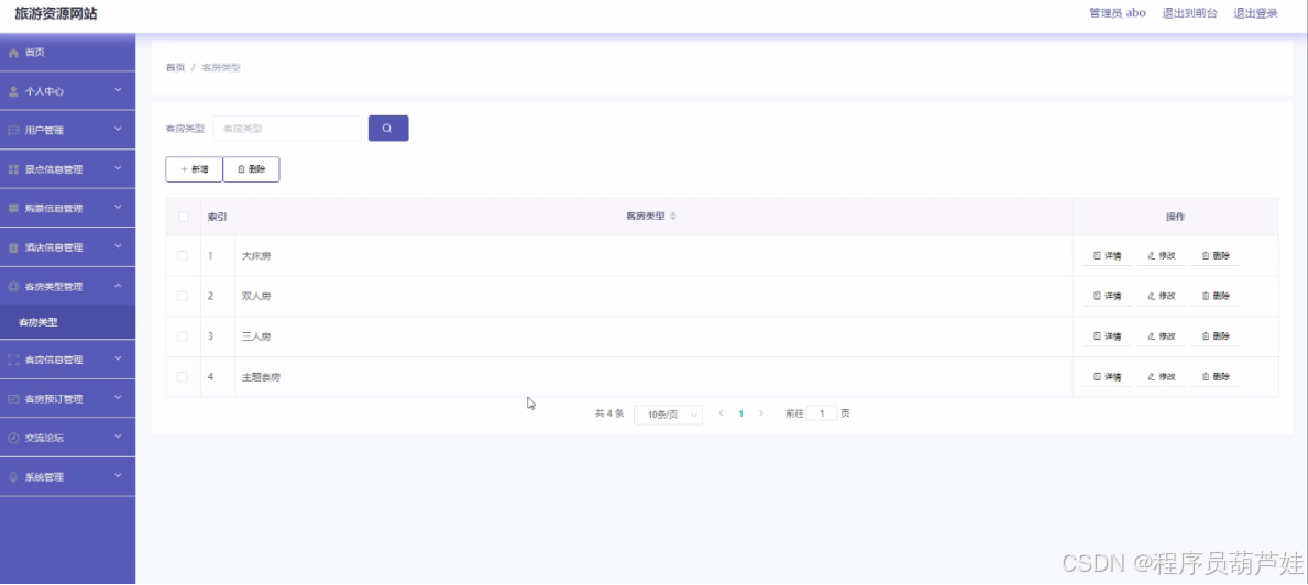 图5-9客房类型管理界面图【客房类型管理,在客房类型管理页面中可以填写客房类型等信息,并可根据需要对已有客房类型管理进行修改或删除等详细操作,如图5-9所示。】