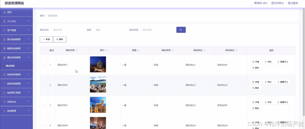图5-8酒店信息管理界面图【酒店信息管理,在酒店信息管理页面中可以填写酒店名称、图片、星级、酒店类型、酒店地址、联系电话等信息,并可根据需要对已有酒店信息管理进行修改或删除等操作,如图5-8所示。】