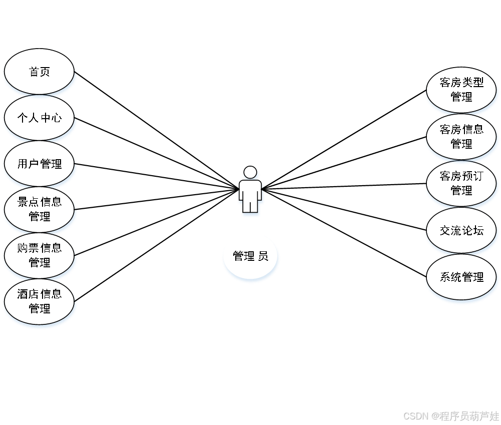 (1)管理员模块:系统中的核心用户是管理员,管理员登录后,通过管理员功能来管理后台系统。主要功能有:首页、个人中心、用户管理、景点信息管理、购票信息管理、酒店信息管理、客房类型管理、客房信息管理、客房预订管理、交流论坛、系统管理等功能。管理员用例图如图3-1所示。