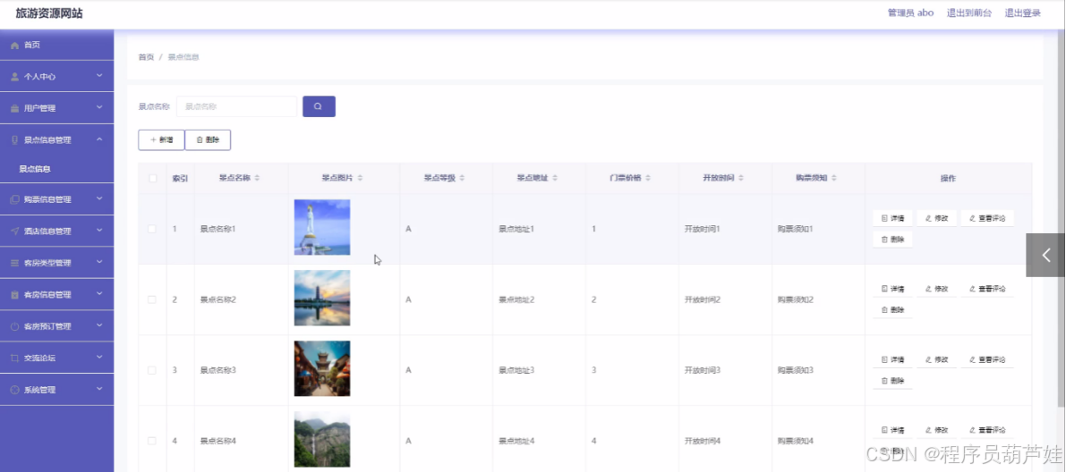图5-7景点信息管理界面图【根据需要对景点信息管理进行详情,修改或删除等详细操作,如图5-7所示。】