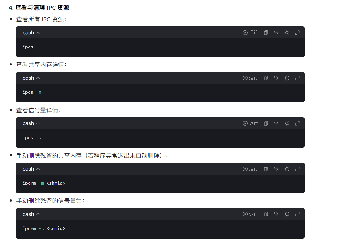 控制共享内存(删除共享内存段等)原型:int shmctl(int shmid, int cmd, struct shmid_ds *buf);参数:- shmid:共享内存标识符- cmd:操作命令(IPC_RMID:删除共享内存段)- buf:共享内存属性结构体指针(删除时设为 NULL)返回值:成功返回 0,失败返回 - 1 |