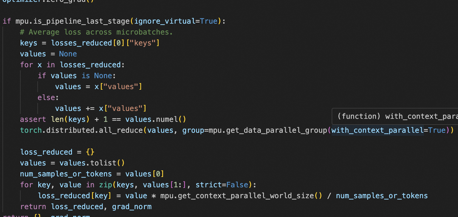 pretrain_gpt.py中的loss_func执行。而这个loss_func的返回值,正是我之前简化描述的那个结构!它会返回类似(unscaled_loss, {'num_tokens': num_tokens_in_batch})的东西。 forward_backward_func拿到这个(unscaled_loss, denominator)对,并将其打包成我之前描述的{"keys": [...], "values": ...}的格式,追加到losses_reduced列表中。