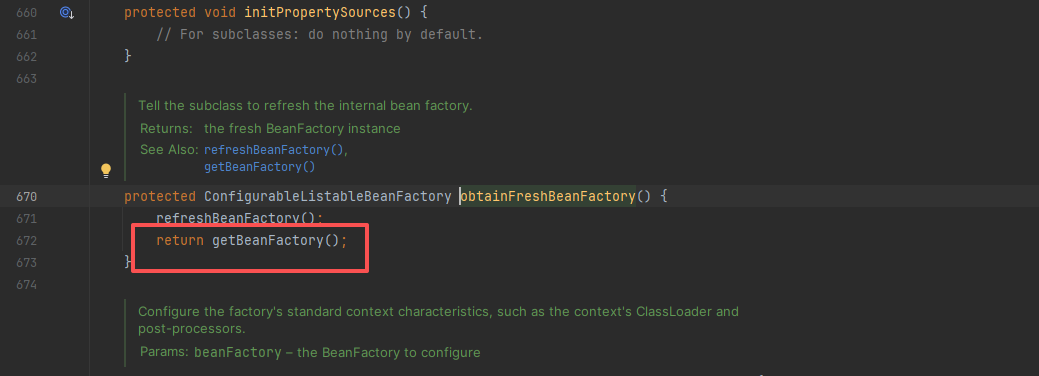 返回当前应用上下文中的ConfigurableListableBeanFactory,这也是个接口类型的,这个接口有一个唯一的实现类:DefaultListableBeanFactory。