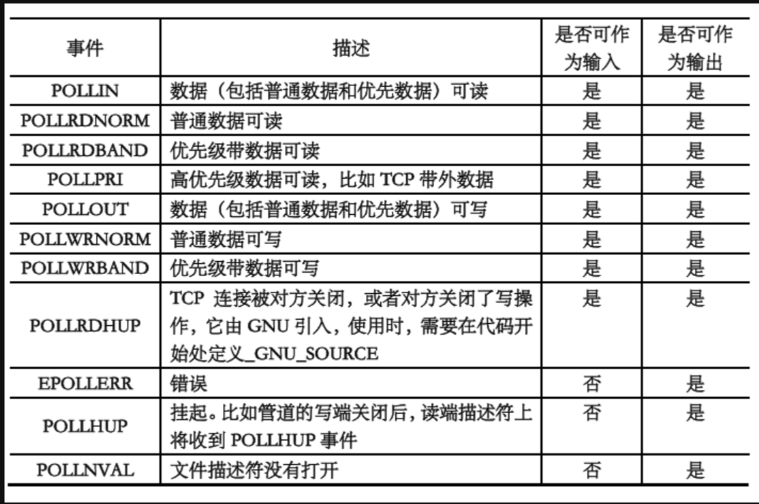 POLLIN读事件是接收缓冲区有数据了就有事件发生,POLLOUT写事件是发送缓冲区只要空着,还有空间,就会有事件发生,所以一开始发送缓冲区空着就会有写事件发生。这个写事件是应用于发送大量数据,但发送缓冲区没有呢么大,如果发送缓冲区满着,send就会阻塞住,所以可以用写事件的发生来检测发送缓冲区是否有空间可以写数据。
