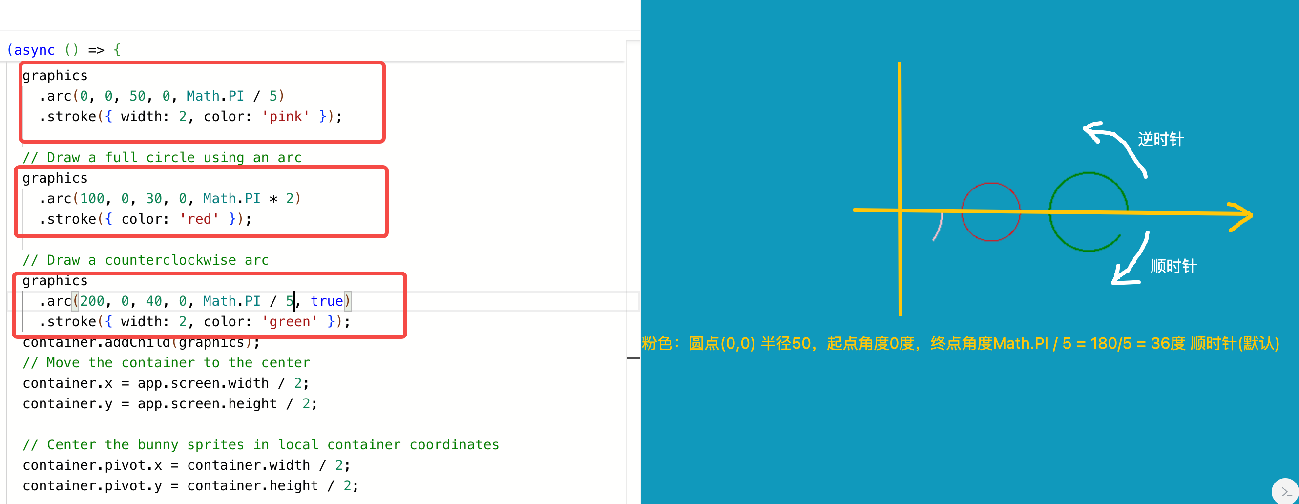 pixijs中画布原点在左上角,向右是x的正方向,向下是y的正方向(这点和数学坐标系相反)。