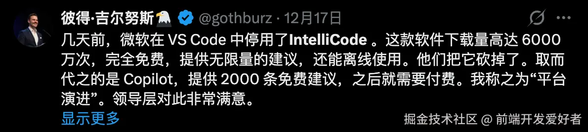 正如一位开发者在 Hacker News 上的评论:「我们享受了十年免费的顶级开发工具,是时候为价值付费了。只是希望微软别忘了:开发者不是待宰的羔羊,而是生态的根基。」