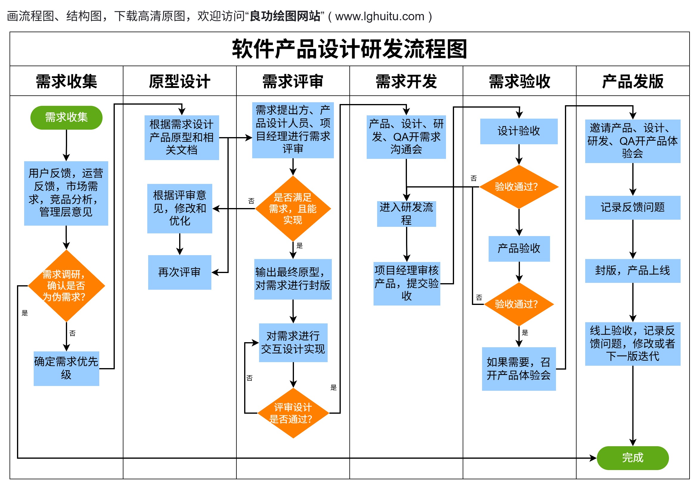 在项目管理场景中,跨职能泳道图的应用范围极为广泛。例如,在项目启动阶段,可用于梳理需求收集、评审、确认的全流程,明确市场部、产品部、研发部的协作边界;在执行阶段,可用于制定采购、生产、质检、交付的流转流程,避免部门间推诿扯皮;在收尾阶段,可用于复盘项目验收、资料归档、成果移交的关键步骤,优化后续项目的协作模式。此外,跨职能泳道图还可用于流程优化、员工培训、客户沟通等场景,无论是复杂的大型项目,还是简单的日常工作流程,都能通过它实现可视化、规范化管理。