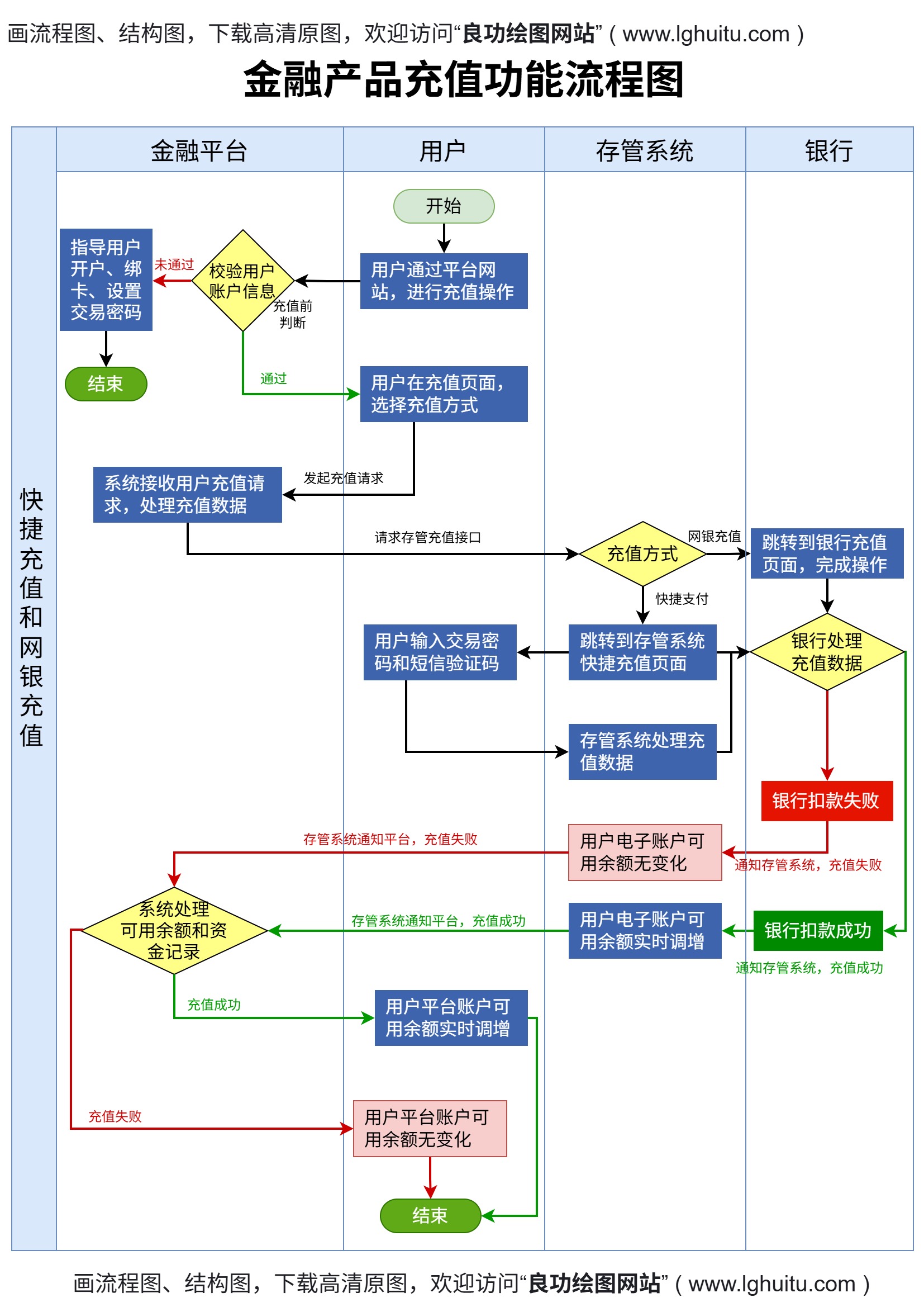 - 金融平台泳道:指导用户开户→接收充值请求→处理充值数据→通知充值结果