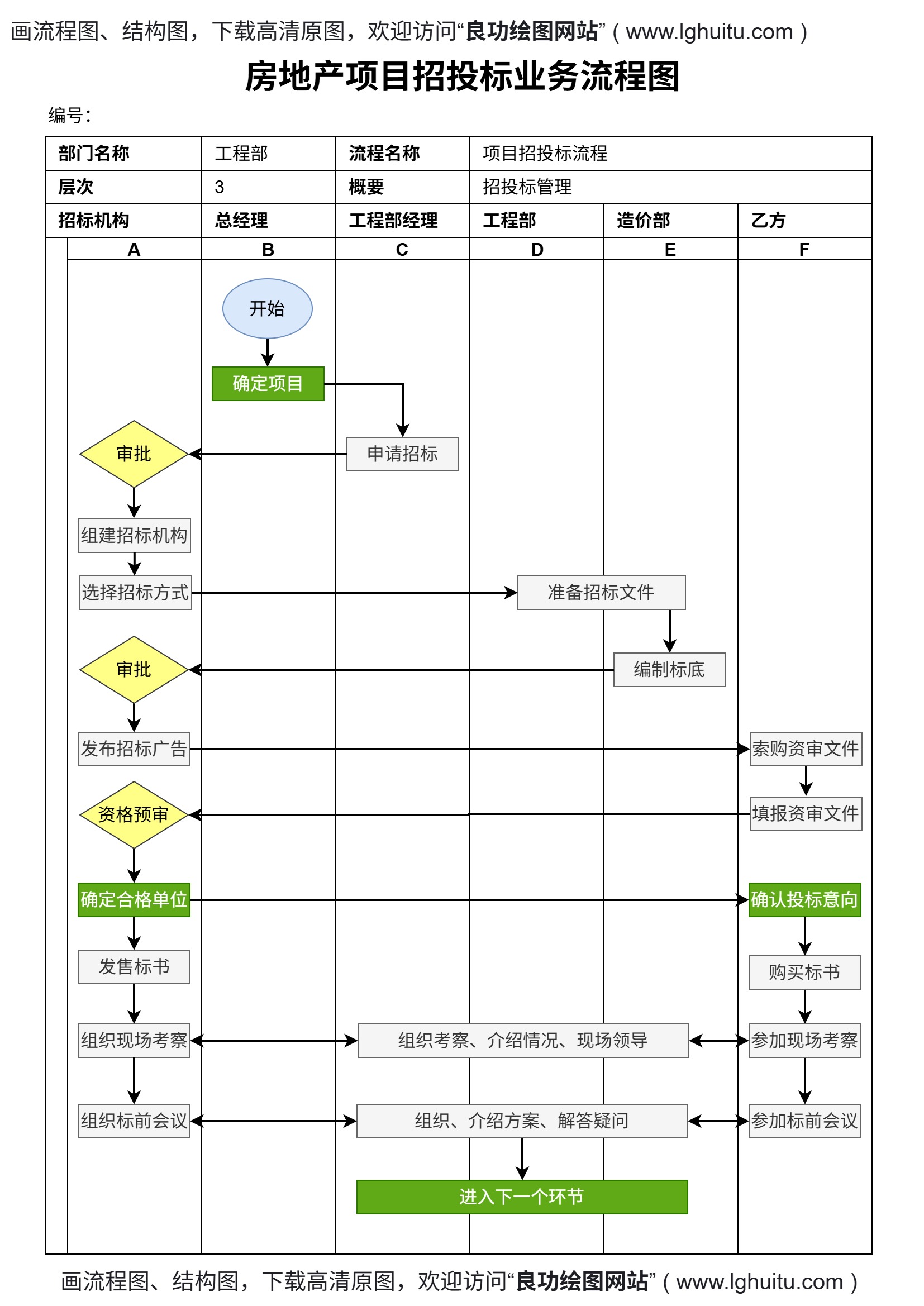 - 工程部泳道:确定项目→申请招标→编制标底→介绍项目情况→解答疑问