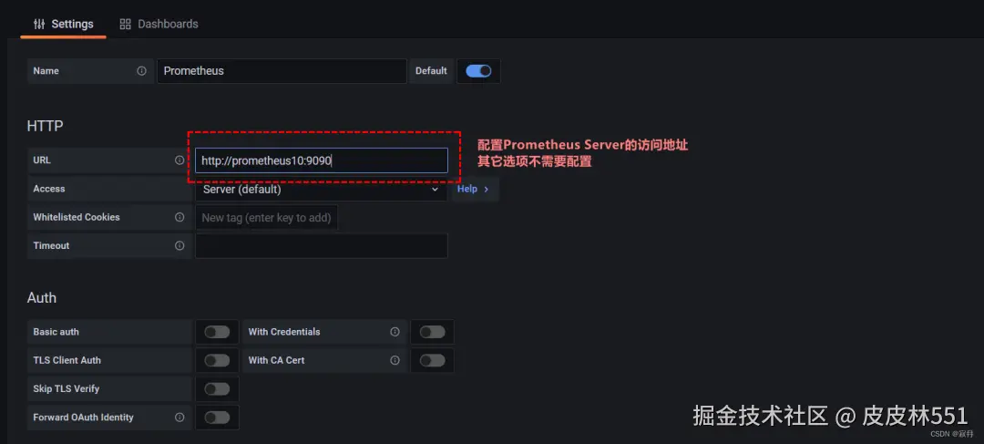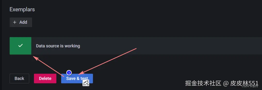 4.点击下方的Save & Test,出现绿色的Data source is working 即说明Prometheus正常联通