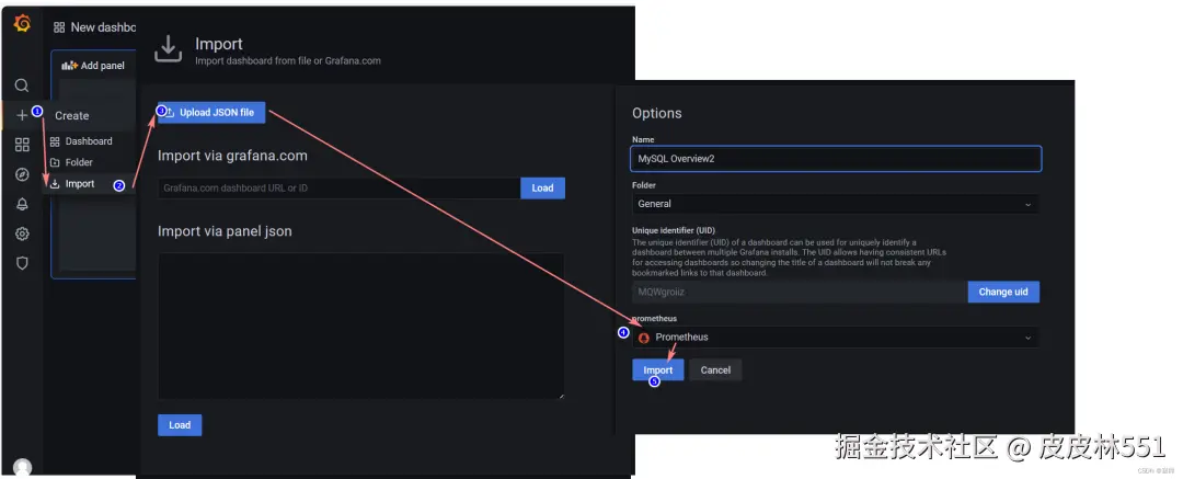 Grafana 中所有的 Dashboard 通过 JSON 进行共享,下载并且导入这些 JSON 文件,就可以直接使用这些已经定义好的 Dashboard: