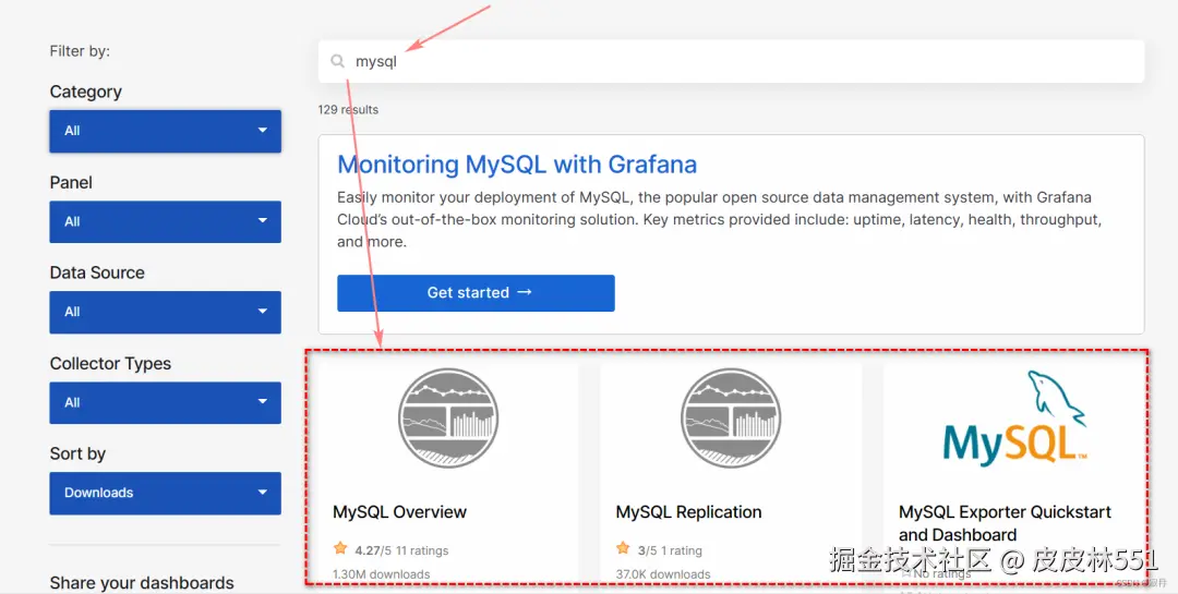 手动一个个添加 Dashboard 比较繁琐,Grafana 社区鼓励用户分享 Dashboard,通过https://grafana.com/dashboards网站,可以找到大量可直接使用的Dashboard模板。