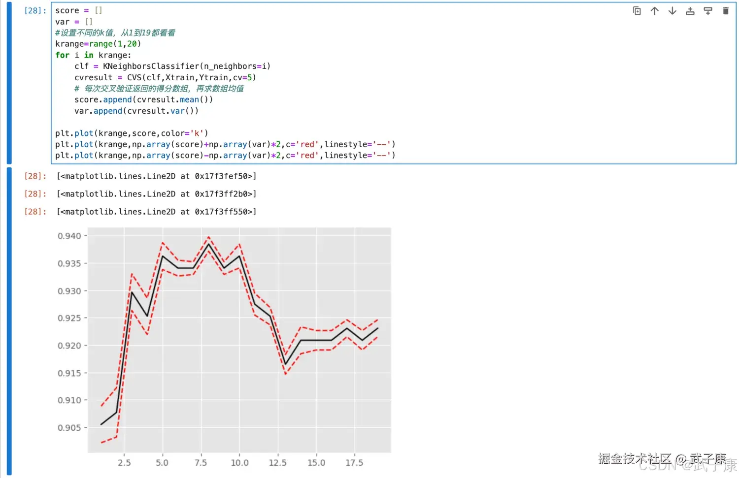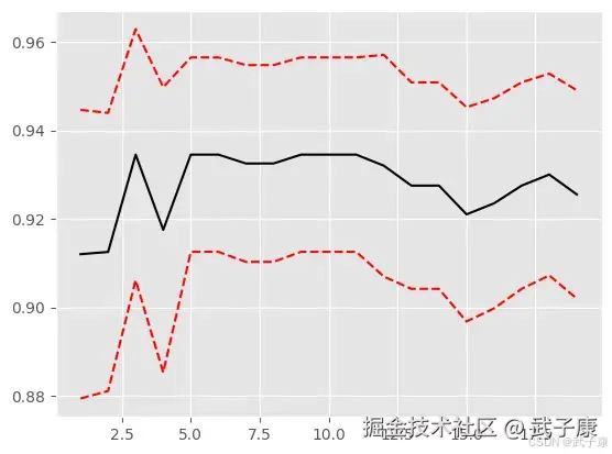 对于带交叉验证的学习曲线,我们需要观察的就不仅仅是最高的准确率了,而是准确率高且方差还相对较小的点,这样的点泛化能力才是最强的,在交叉验证+学习曲线的作用下,我们选出的超参数能够保证更好的泛化能力。