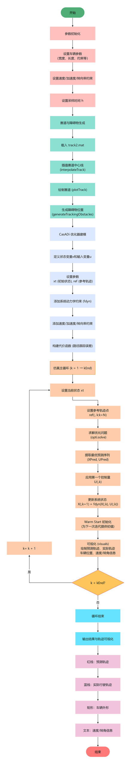 本文针对上述问题,基于 NMPC 设计了一种自动驾驶路径跟踪与避障控制器。具体工作包括:建立车辆非线性单轨动力学模型;在考虑速度、加速度、转向角速度等约束条件下,构建以轨迹跟踪误差最小化为目标的优化问题;利用 MATLAB 与 CasADi 工具进行非线性优化求解;通过仿真实验验证控制器在路径跟踪精度、避障性能及约束满足方面的有效性。研究结果表明,该控制方法能够兼顾安全性与实时性,为自动驾驶车辆的运动控制提供了有力支持。