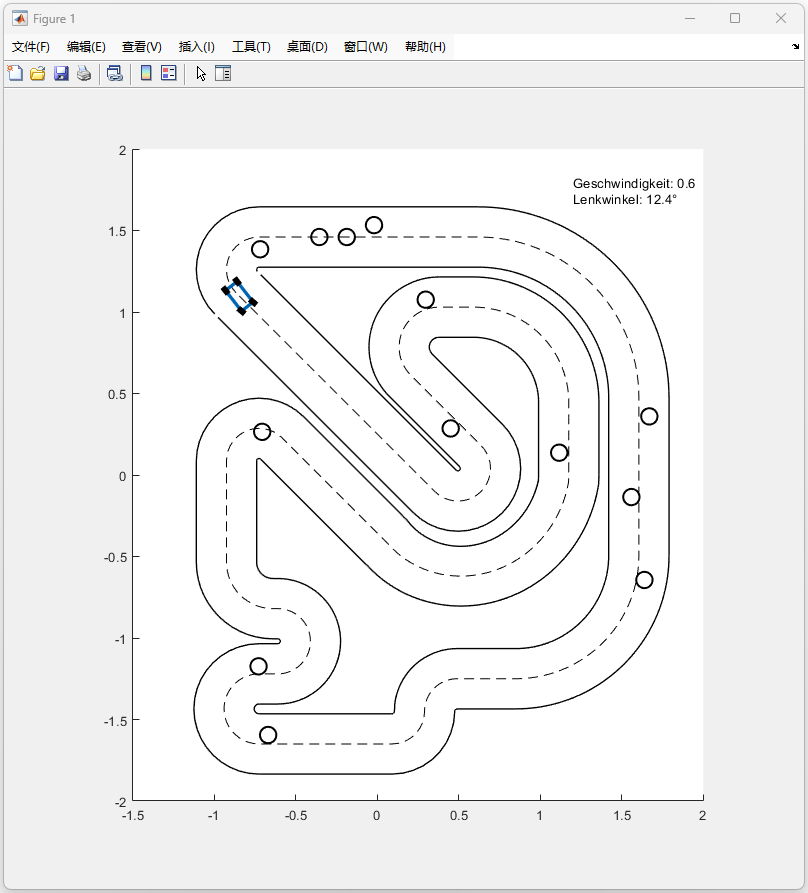 图展示了车辆在非线性MPC控制器作用下沿赛道中心线进行路径跟踪的过程,同时实现对静态障碍物的有效避让。黑色实线为赛道边界,虚线为参考中心线,圆圈表示障碍物位置。蓝色矩形代表车辆当前姿态,红色轨迹为预测路径。图右上角的文本显示了当前车辆速度(0.6 m/s)和前轮转向角(12.4°)。从图中可以看出,车辆能够在约束条件下保持较高的路径跟踪精度,并在遇到障碍物时进行避让,验证了基于NMPC控制方法的有效性和可行性。