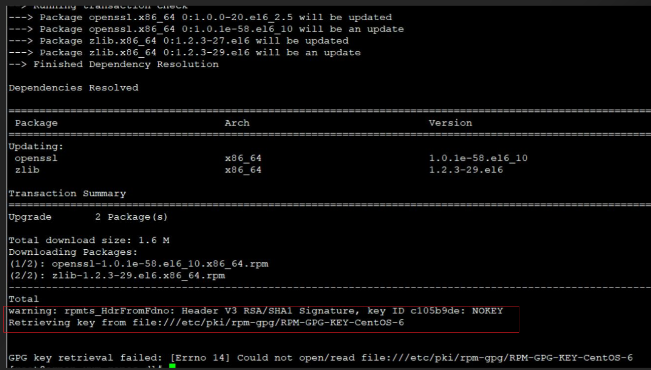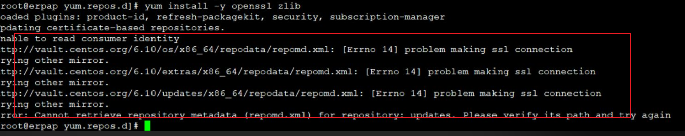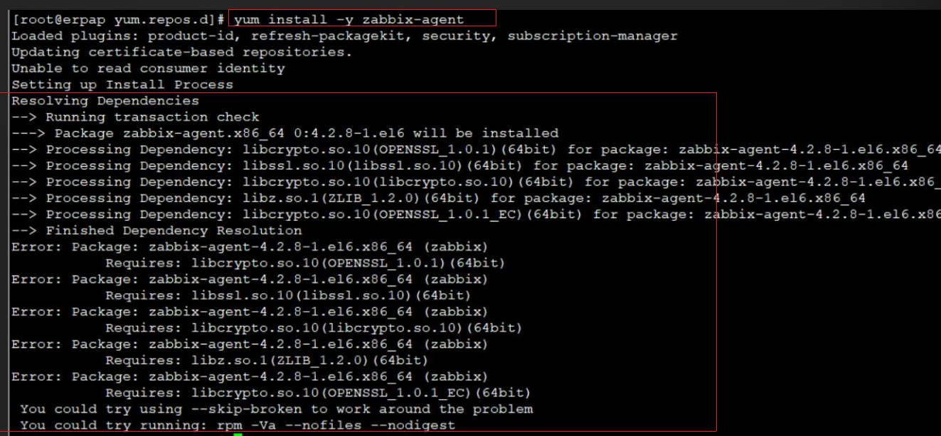 5.继续执行yum安装命令报错如下,提示缺失特定版本的系统软件依赖包:缺少几个OpenSSL和Zlib的库文件,比如libcrypto.so.10、libssl.so.10、libz.so.1这些。RedHat 6默认的OpenSSL版本可能比较低,或者仓库里的包不对,所以得先处理依赖