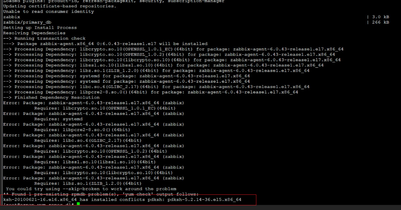 提示错误: ksh-20100621-16.el6.x86_64 has installed conflicts pdksh: pdksh-5.2.14-36.el5.x86_64表示系统存在跨版本(el6/el5)的冲突包,需先清理: