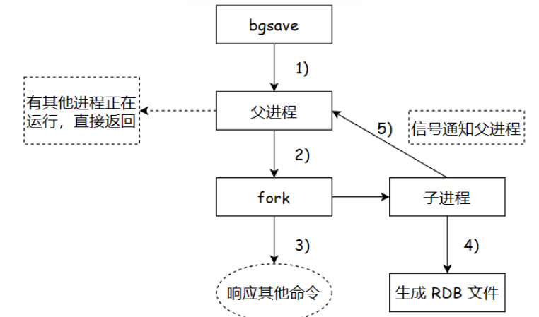 若不存在,则父进程执行 fork 命令创建子进程,fork 执行期间会阻塞父进程,fork 执行完毕后返回 Background saving started ,不再阻塞父进程。