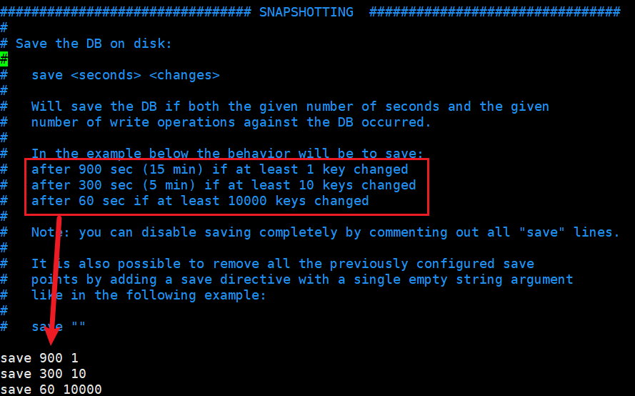 过了 900 秒,且这 900s 内至少有 1 个 key 改动,就生成快照,剩下的 300 和 60 规则同理。
