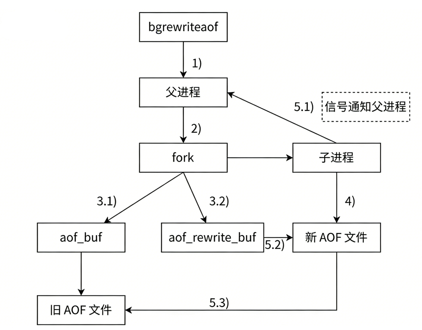 创建完子进程,子进程写新的 aof 文件, 父进程仍可以接收客户端的新命令,并将数据写入 aof_rewrite 和