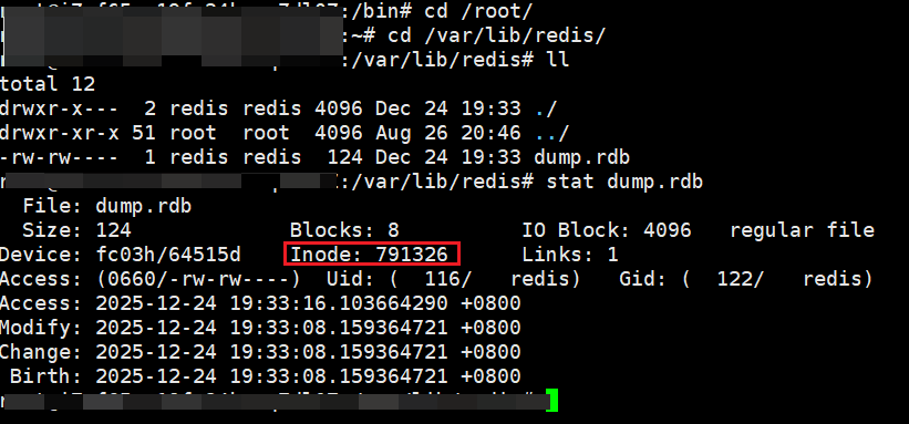 这里数据量太少,持久化速度太快,难以观察到子进程,但是可以观察到 新文件替换旧文件,在使用 stat 命令查看 dump.rdb 的 inode 编号即可( inode 相当于 文件的身份证)