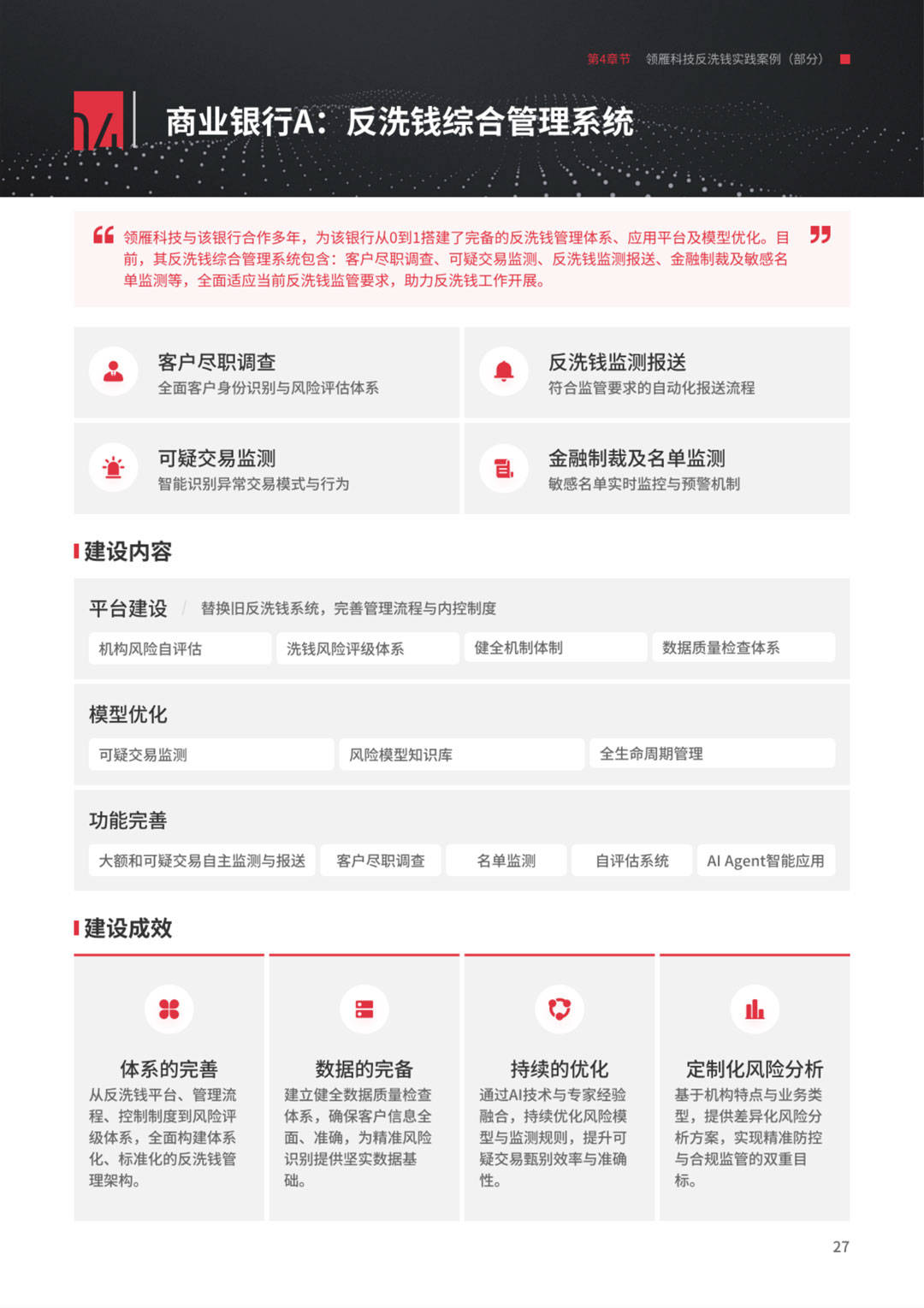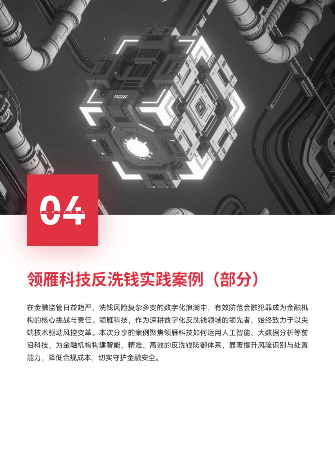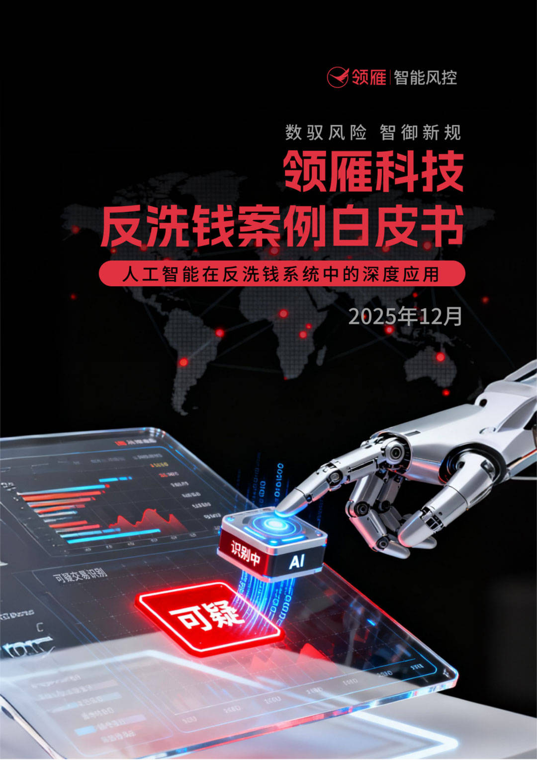 在此变革之际,领雁科技基于在反洗钱与金融合规领域近二十年的持续深耕,正式发布《数驭风险 智御新规------领雁科技反洗钱案例白皮书暨人工智能在反洗钱系统中的深度应用》白皮书。我们不仅见证了中国反洗钱体系的每一次演进,更深耕于上百家银行、证券、保险、金融租赁、财务公司等金融机构,为其提供从顶层咨询、管理体系构建、智能系统建设到全流程落地实施的服务,积累了穿越周期的宝贵经验。