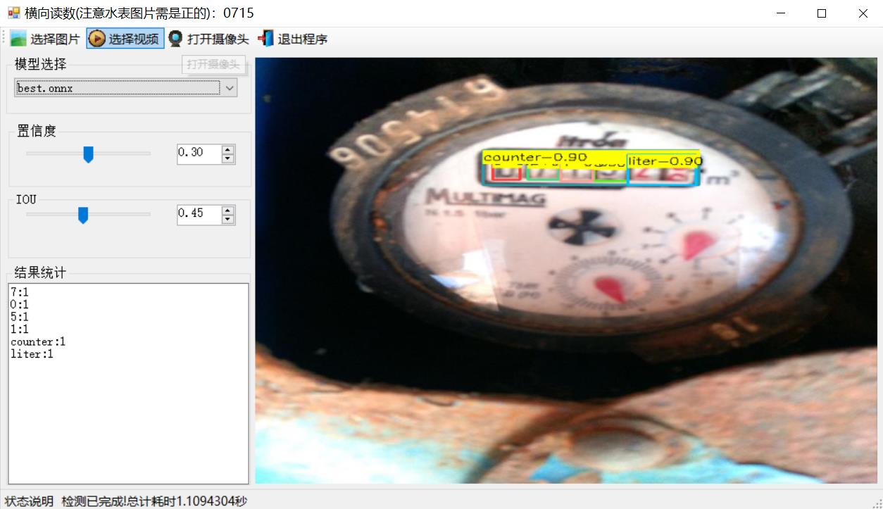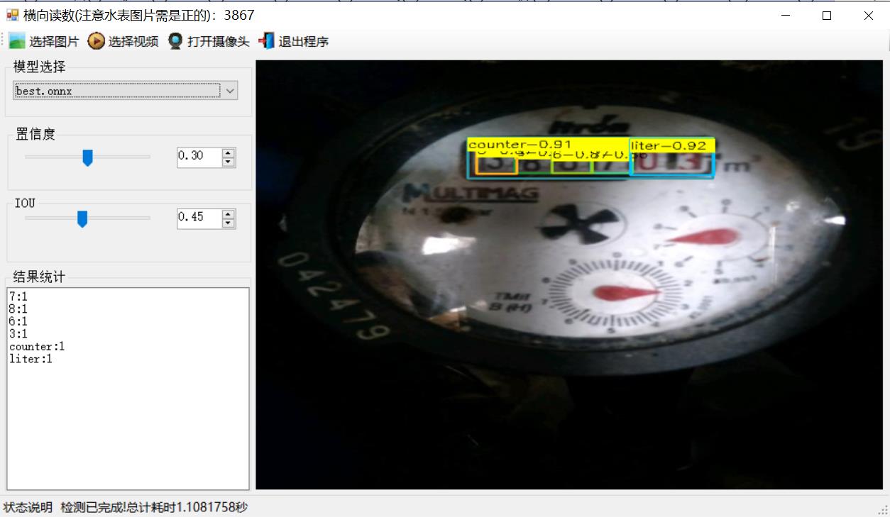 注意:系统采用yolov8x大模型进行训练,所以单张图片预测1.1秒左右,如果采用yolov8n训练可以达到50ms左右。由于水表方向不确定为了能够正常读取完整水表数字需要正向放置,代码采用位置从左到右提取完整数字,最终显示在软件左上角区域。水表只读取整数部分,小数部分只检测没有识别,因为这个主要是依靠目标检测进行定位识别。