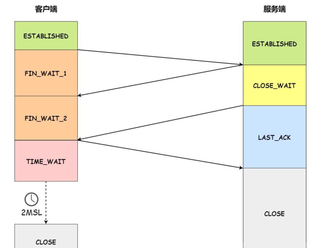 - 第四次挥手 :客户端发送 ACK (ACK=y+1)标志的数据包->服务端,然后客户端进入TIME-WAIT 状态,服务端在收到 ACK (ACK=y+1)标志的数据包后进入** CLOSE 状态**。此时如果客户端等待 2MSL 后依然没有收到回复,就证明服务端已正常关闭,随后客户端也可以关闭连接了。