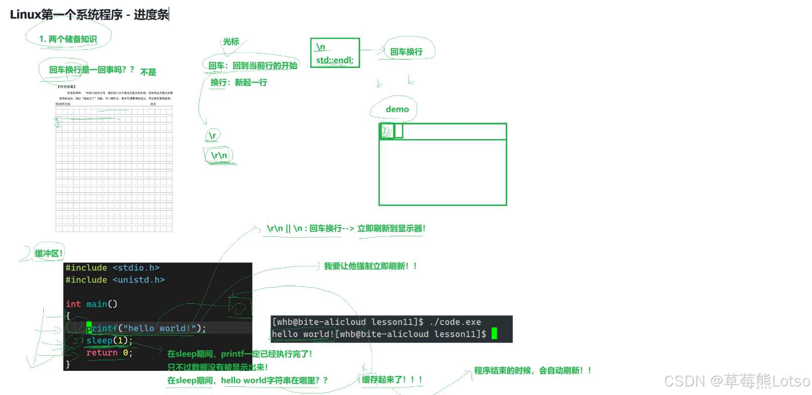 - 如果只写printf 而不加\n或fflush,内容会一直存在缓冲区,终端看不到任何输出,这就是很多人写进度条 "没反应" 的原因。