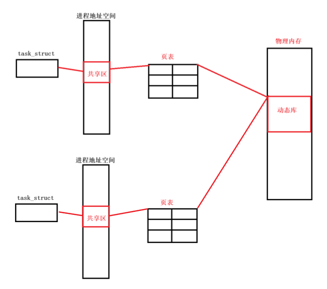 而系统在运行中,一定会存在多个动态库,这些动态库会被操作系统管理起来(先描述再组织),也就是说操作系统了解所有库的加载情况。当存在多个进程需要使用一个库的情况时,操作系统会分析物理内存中是否存在该库,如果存在,直接会让这些进程直接建立联系,将库的代码通过页表映射保存在共享库中,也就说在物理内存中只需要保存一份库的代码即可,这个库也被称为动态库/共享库。
