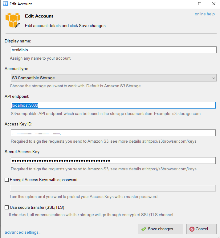 Secret Access Key: 你的 MinIO Secret Key(默认:minioadmin)