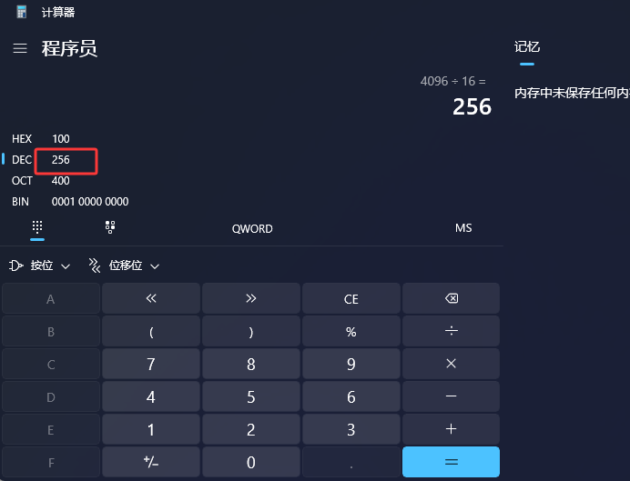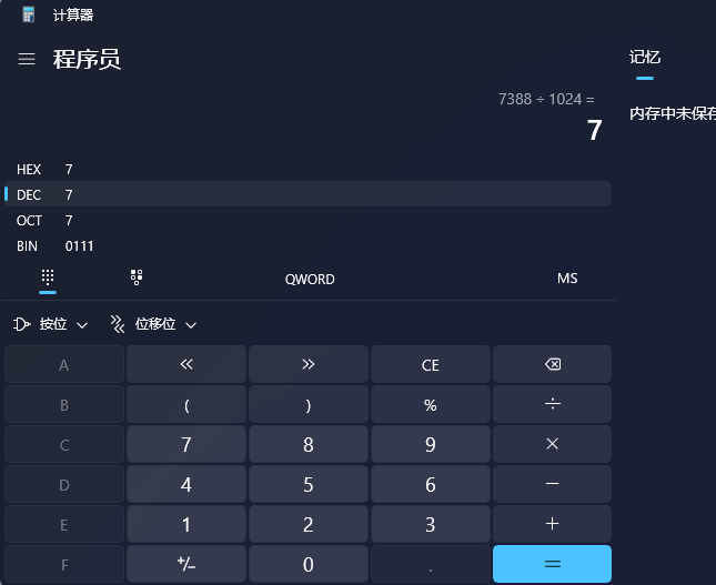 一个内存页只能存放256个,但是这个序号是4自增的,也就是说0是256里的第一个,4是256里的第二个,8是256的第三个,所以我们先要把256换算成索引,256乘以4结果是1024,也就是说一个内存页最大的索引是1024,上图我们的pid是7388,如下图也就是说我们的am.exe在第7个内存页中,