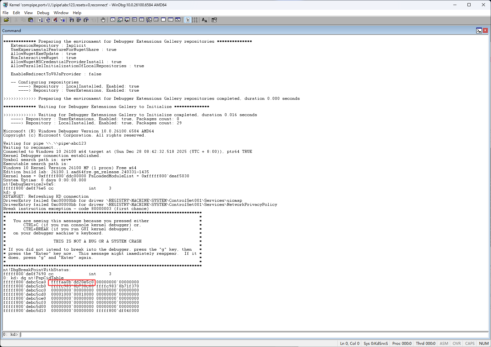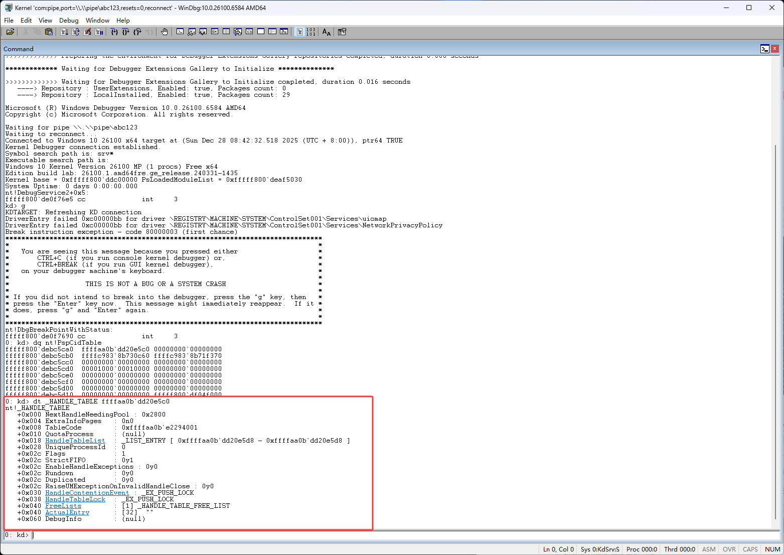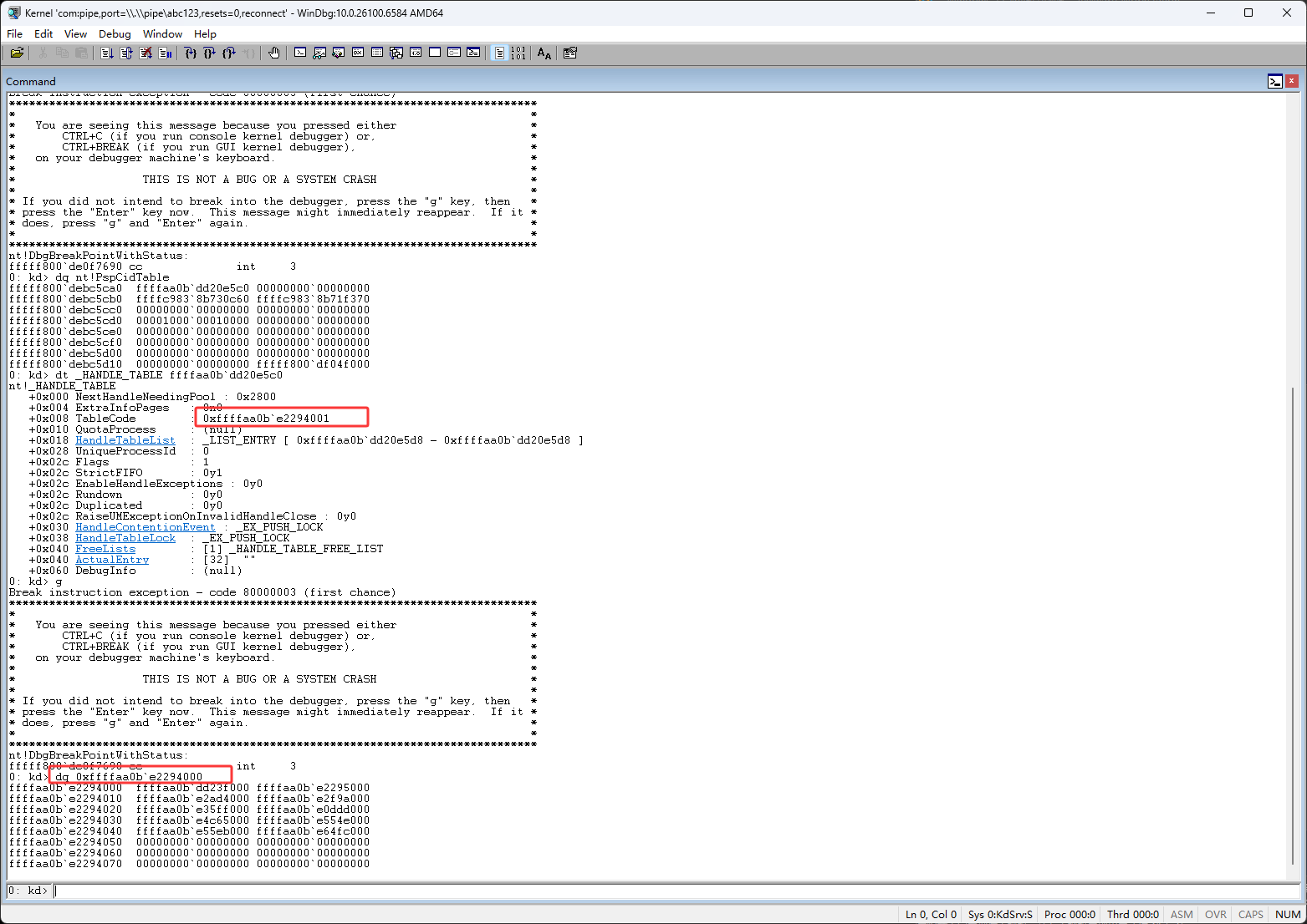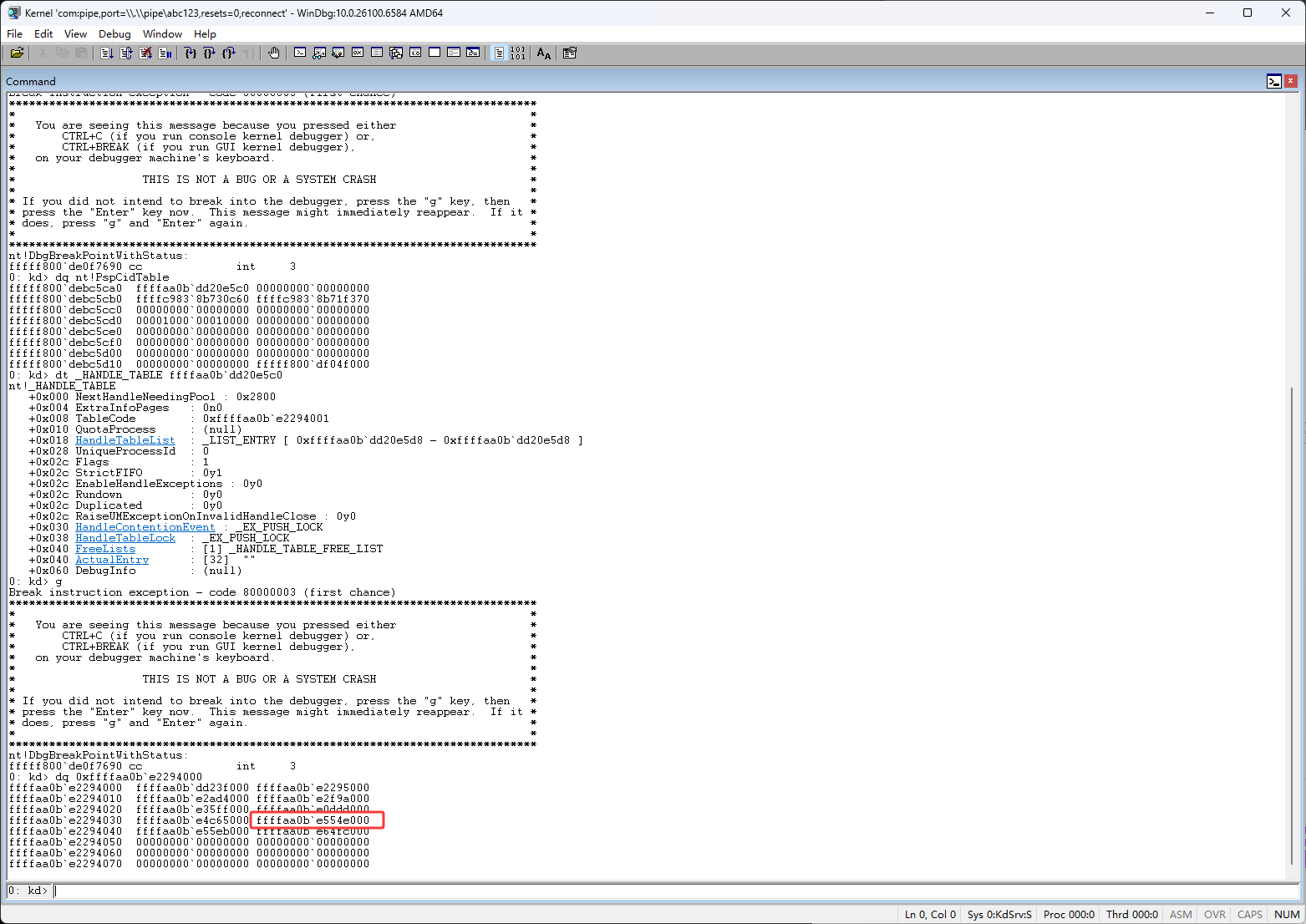 还有一个PspCidTable的结构,这个结构存放了 _HANDLE_TABLE,下图红框就是_HANDLE_TABLE的地址,dq nt!PspCidTable