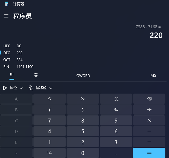 然后7388减7168结果是220,这说明我们的am.exe在第七个内存页中的220位置,7168的来源是1024 乘以 7,这个7是通过上方7388除以1024得到的