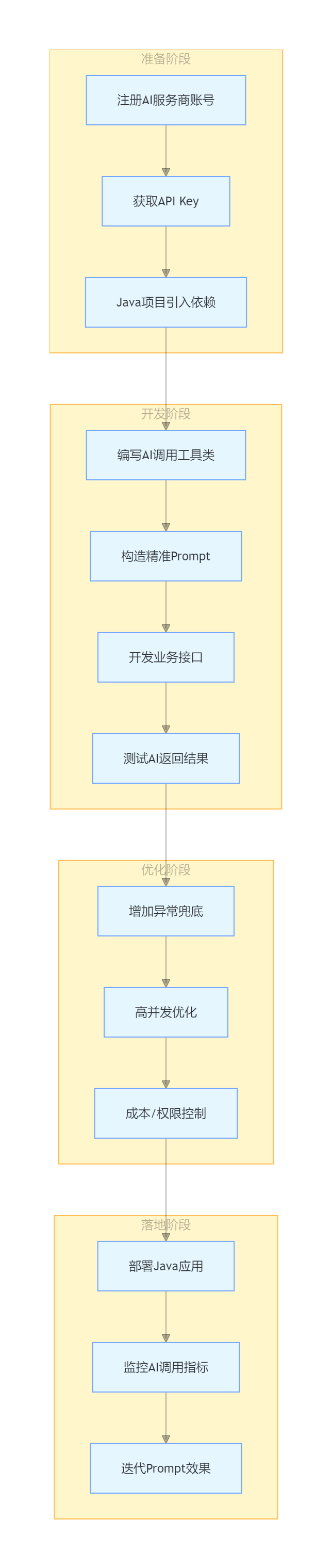 落地关键:封装通用 AI 调用工具类 + 构造精准 Prompt(决定 AI 输出质量) + 增加异常兜底;