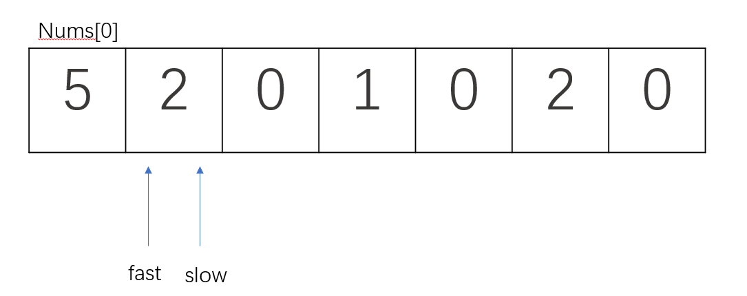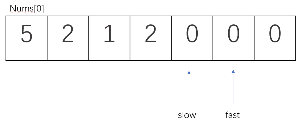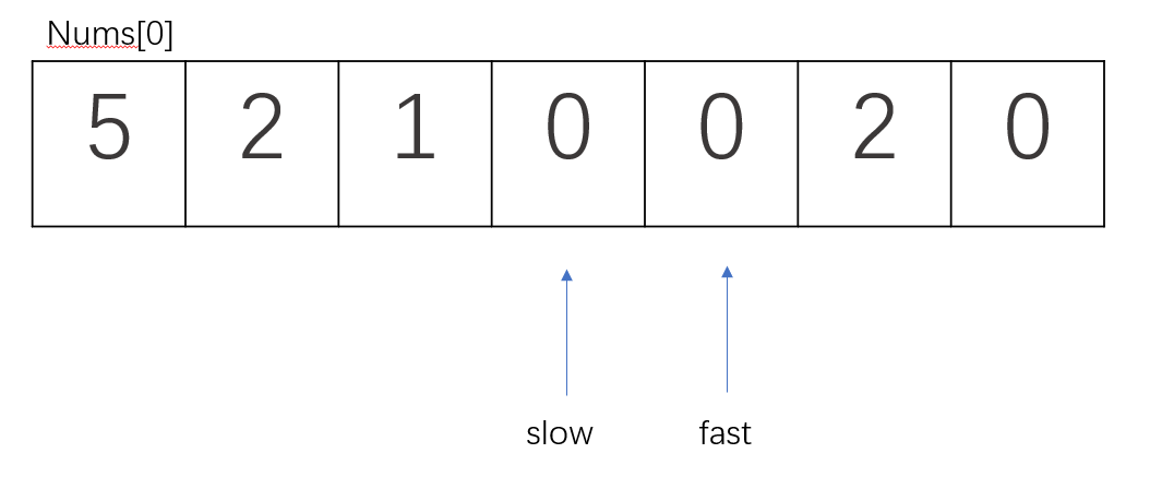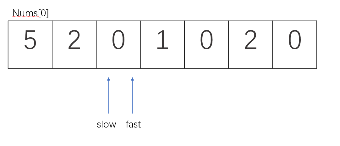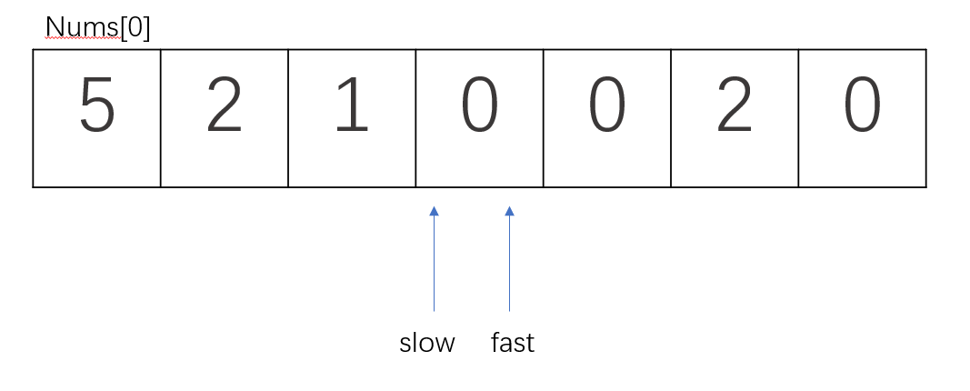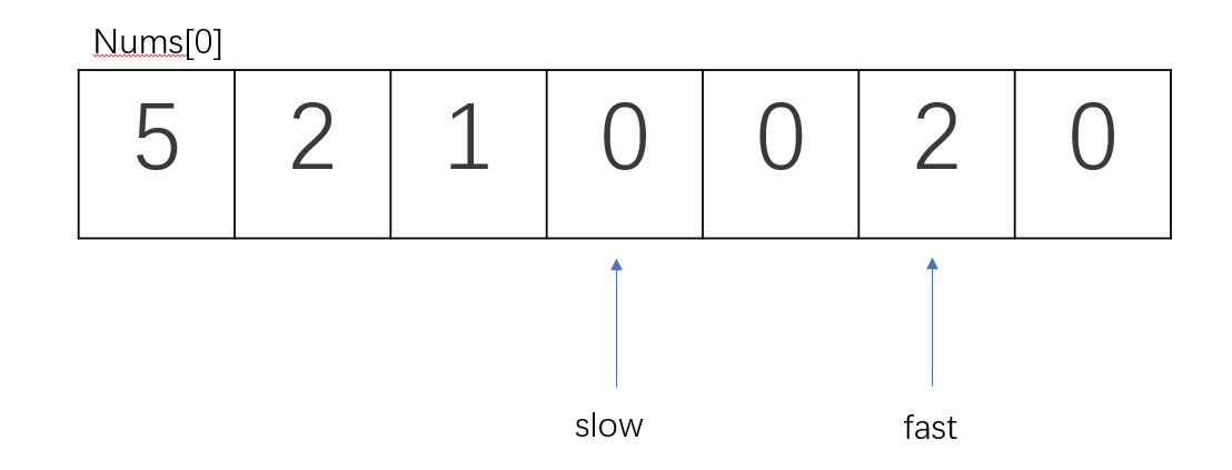 Nums[fast]为0时,slow不再自增,fast继续向前: