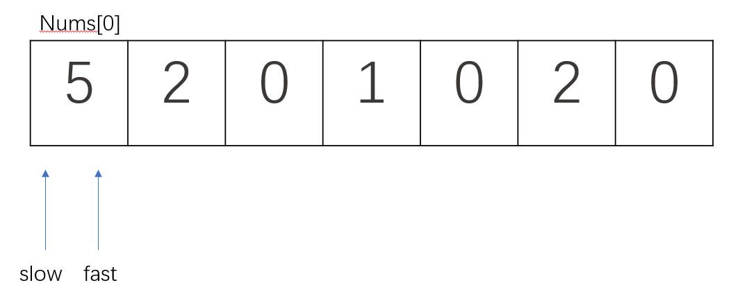 主播现在给大家以"5201020"这个数组举例,初始化状态下,快慢指针都指向首元素:
