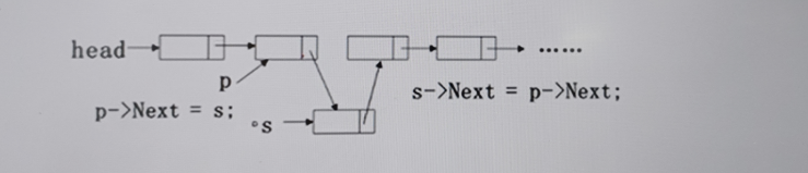 S->Next = P->Next; //新结点插入在第i-1个结点的后面