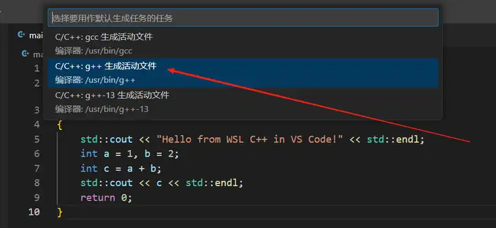 - VS Code 底部状态栏会出现 CMake 相关的按钮。点击状态栏中的 "No Kit Selected"(或类似字样),然后选择 WSL 中的 GCC/G++ 工具链(